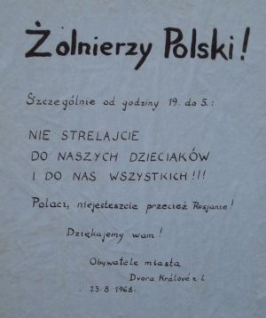 Żołnierz wojsk pancernych Maciej Żytecki wspominał podchodzących do jego czołgu Czechów, którzy zapraszali do „słuchania ich powstańczych radiostacji”. Mówili też, że walczą o swoją wolność i prosili, żeby Polacy im w tym nie przeszkadzali. Powstawały jednak kolejne polskie garnizony wojskowe, które odpowiedzialne były za propagandę i pilnowanie porządku. Wystąpienia antykomunistyczne musiały być karane, stąd w świadomości wielu mieszkańców Czechosłowacji obecność Polaków zapamiętana została bardzo negatywnie.